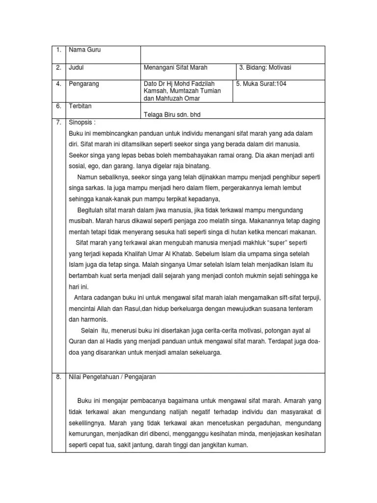 Dia akan menjadi anti sosial ego dan garang. Banyakkan berdiam diri dan berdoa kepada Allah agar Allah selamatkan kita daripada sifat marah. Sinopsis Buku Yang Dibaca.